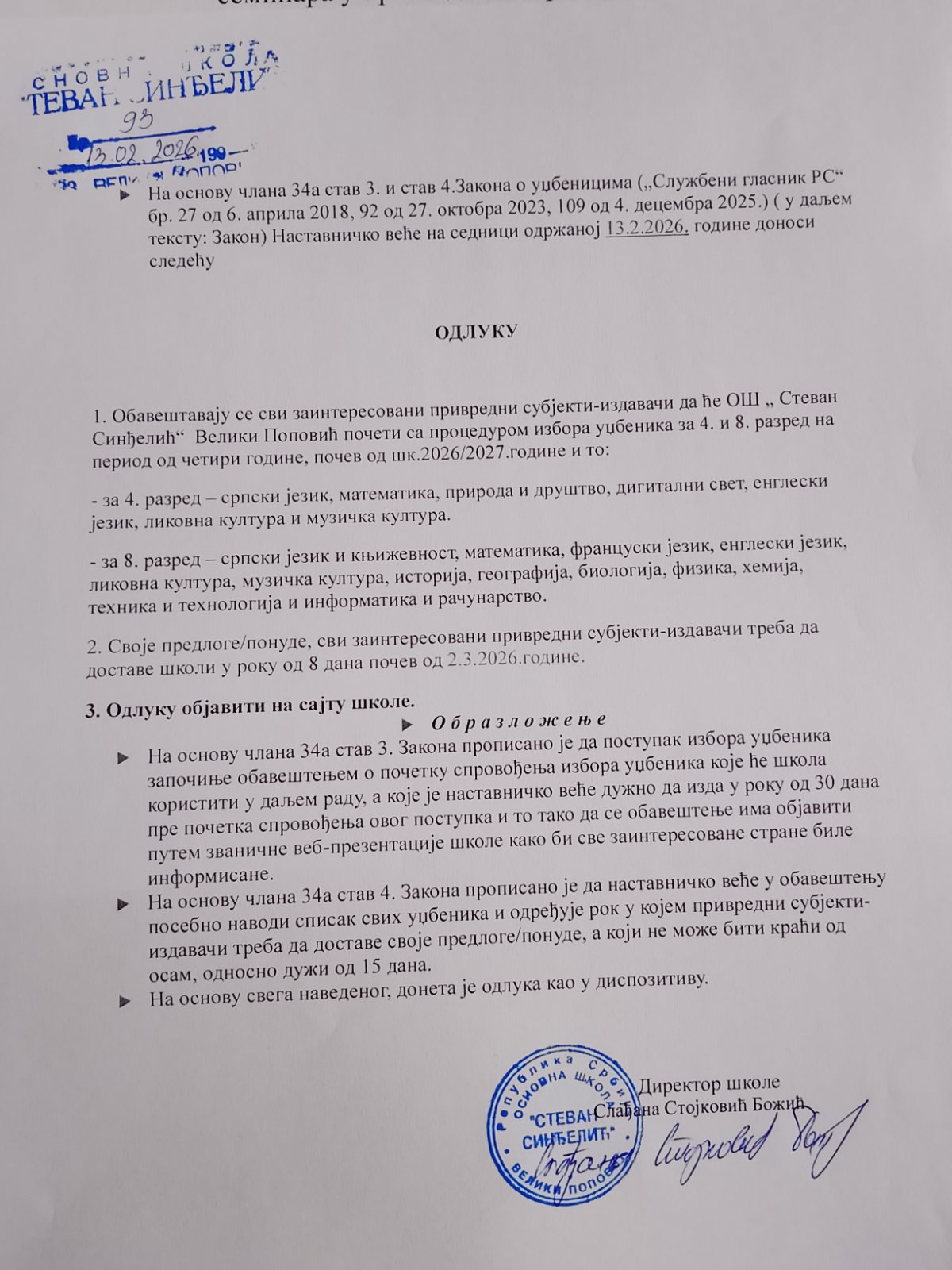 Одлука о избору уџбеника за 4. и 8. разред на период од 4 године